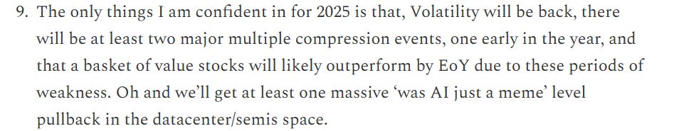 That dip provides some general fuel to tech broadly into Q1 of 2025, but it wasn’t led by AI, with various other pieces of the tech trade taking turns with leadership. That lack of leadership by AI/datacenter was justified with part of my 9th point in my ‘100 thoughts about 2025’ came true with the announcement of DeepSeek.