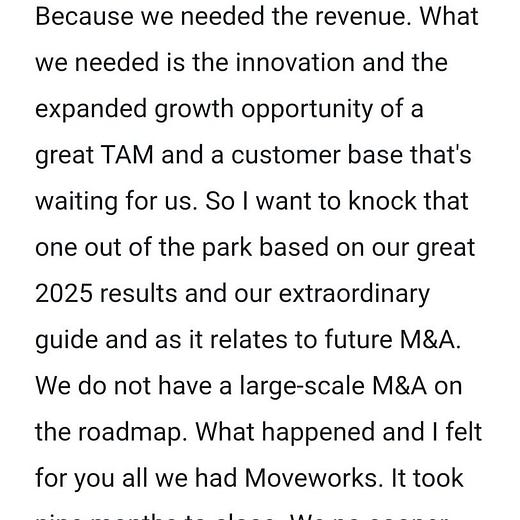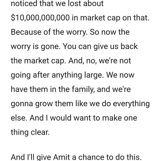 Meanwhile there was this interaction on the ServiceNow call, where Bill McDermott was upset by the market selling the company down 10b due to a purchase of another company.